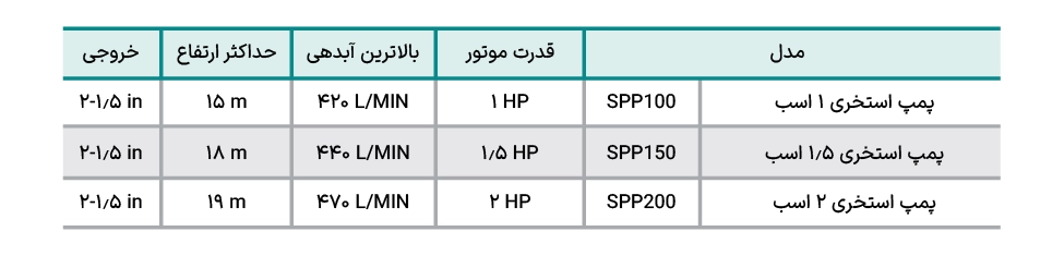 توان: معمولاً پمپهای استخری با توان ۱ تا ۳ اسب بخار (حدود ۰.75 تا ۲.۲ کیلووات) برای استخرهای خانگی مناسب هستند. انتخاب توان بستگی به حجم استخر و میزان آبدهی مورد نیاز دارد.